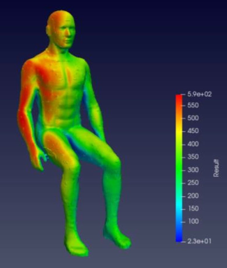 また,人体を模擬した解析メッシュを使用してシミュレーションを行い,人体周辺におけるふく射伝熱量の定量的な算出を行いました.(図2,図3参照)シミュレーションの結果,赤外線ヒーターといった指向性のあるヒーターでは人体周辺でふく射起因の局所温度は10~20℃程度も人体部位によって変動することが明らかとなりました.本結果から,赤外線ヒーターを用いたサウナ室内部の熱バランスを改善する必要性があることを明らかにしました.