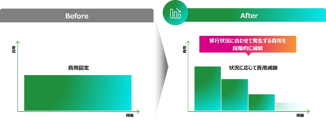 従来、現行システムから新システムへの移行費用は、作業発生時にその都度支払う必要があり、現行システムの運用費用と新システムへの移行導入時の初期費用の二重支払いの負担が課題となっていました。本サービスにより、新システムにかかる費用は、新システムへの移行後からの支払い開始とすることで、新旧システム費用の二重支払いを回避できます。