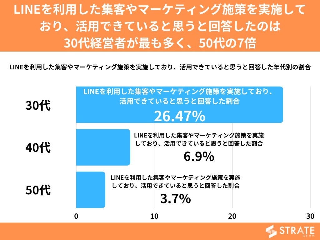 LINEを利用した集客やマーケティング施策を実施しており、活用できていると思うと回答した割合を年代別でみてみますと、30代が26.47%、次いで40代が6.9%、50代は3.7%という結果になりました。