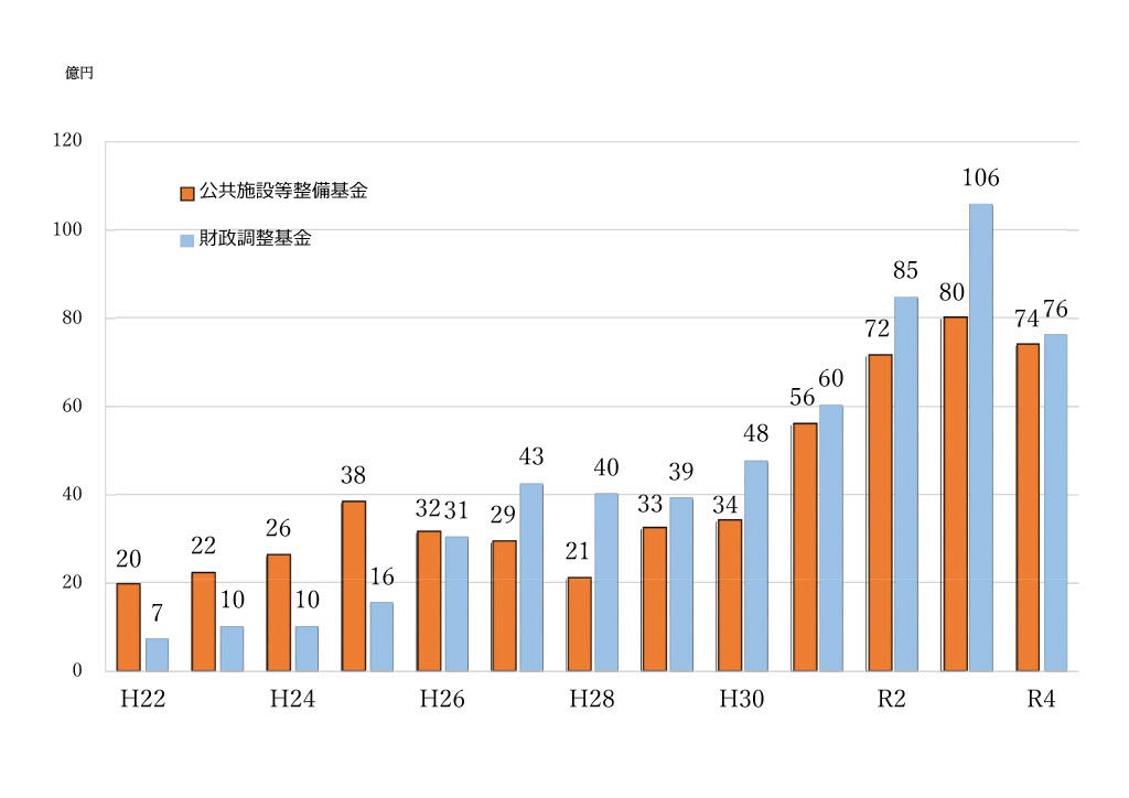 公共施設等整備基金の令和3年度残高見込は80億3,663万4千円、令和4年度当初予算後の残高見込は74億3,332万5千円です。