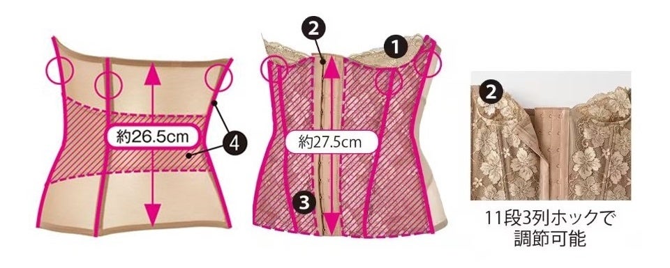 ④ウエストは6本のボーンと広い裏当てでほっそりシェイプ。