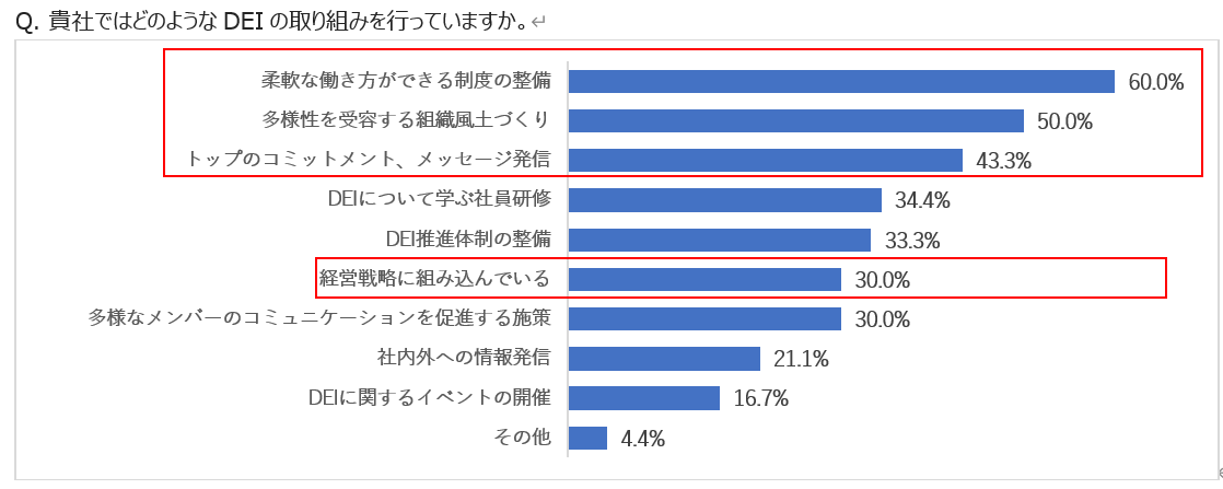 また、「トップのコミットメント、メッセージ発信」(43.3%)や「経営戦略に組み込んでいる」(30.0%)など、少なくない企業がDEIを会社として重要なテーマに位置づけていることもわかりました。