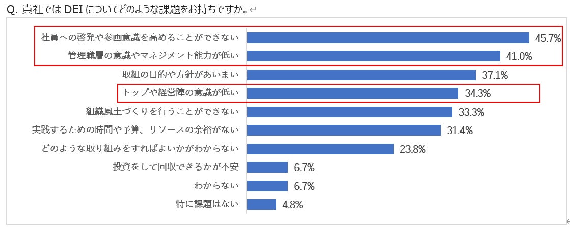 続いて、DEIについての課題を聞いてみると、「社員への啓発や参画意識を高めることができない」がトップの45.7%となり、半数弱がこの課題に頭を悩ませていることがわかりました。DEIは「自分ごとにしてもらう」ハードルが高いテーマだということが伺えます。