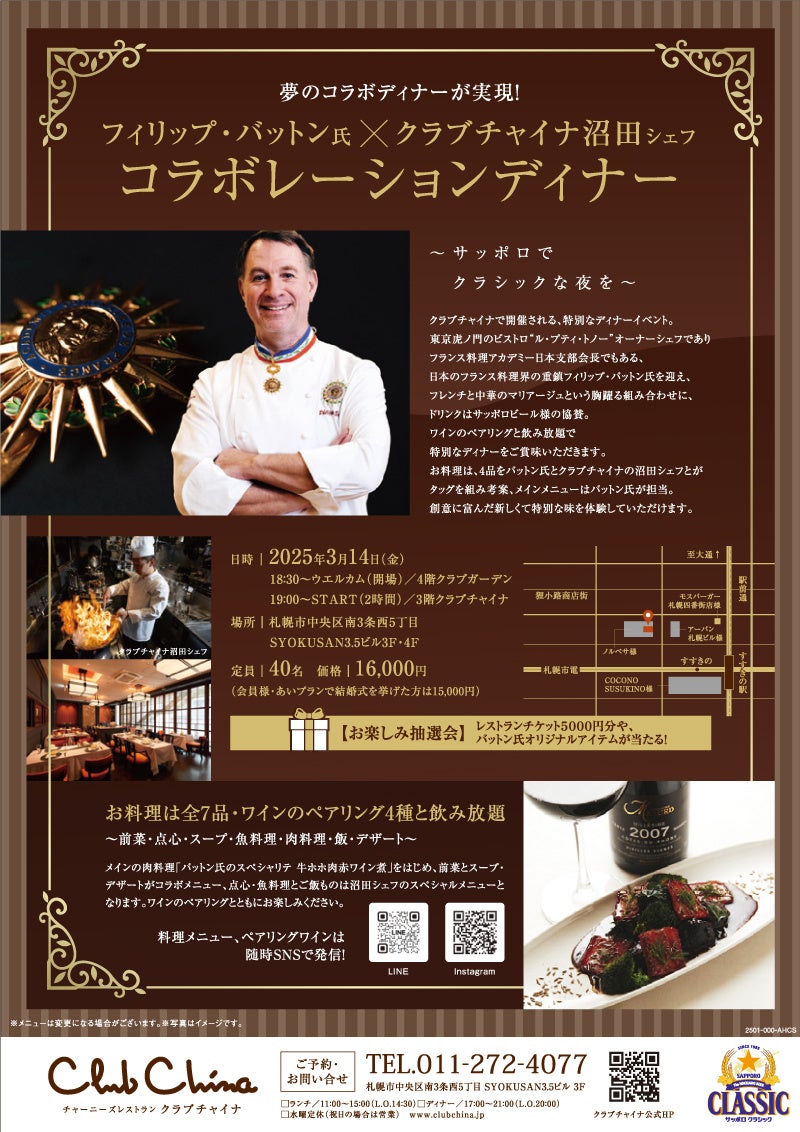 夢のコラボレーションディナーが実現!クラブチャイナで特別なディナーイベントを開催いたします。