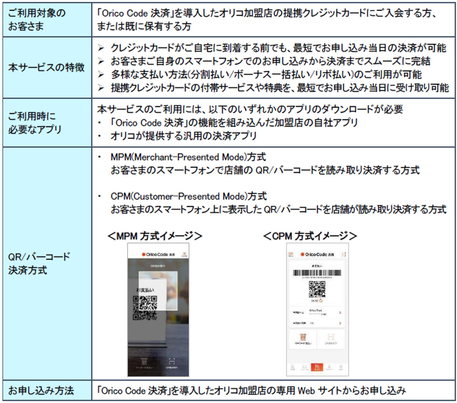 「Orico Code決済」は、スマートフォンのアプリ上で即時利用を可能にする、オリコの提携クレジットカード加盟店向けの利便性が高いデジタル決済サービスです。
