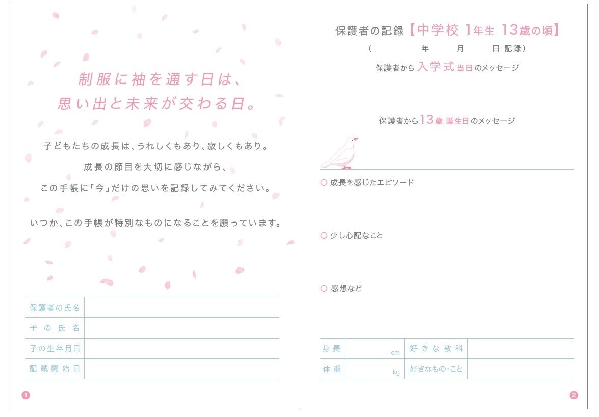 デジタル化が進む現代では、写真などの記録はスマートフォンに多く残されている一方で、文字で残すことが減少してきているのではないかと感じます。中学入学から高校卒業までの成長の記録を直筆で残すことで、子どもたちへの未来へのエールになるのではないかと考えました。母子健康手帳(親子健康手帳)と一緒に保管できるサイズで作成し、現在開催中のキャンペーンノベルティとして配布予定です。