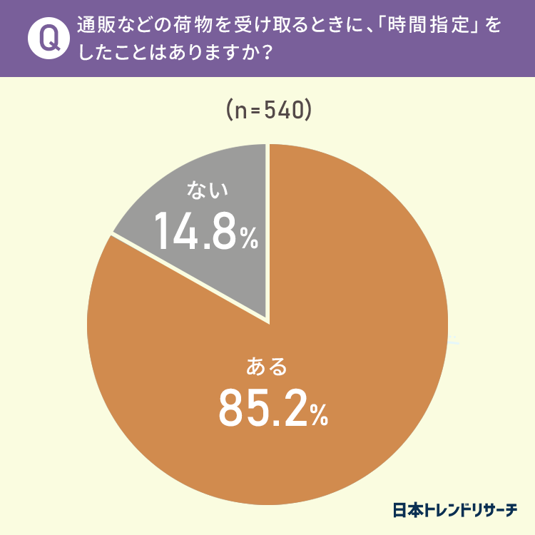荷物を受け取るときに時間指定をしたことが「ある」方は85.2%でした。
