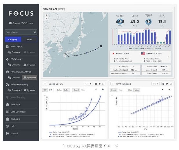 「FOCUS」は、ICTを活用した運航船からの詳細なデータを収集・分析する運航データ解析ソフトウェアです。運航船から得られる詳細な航海・機関データを基に、造船工学手法による高精度な運航モニタリングや推進性能分析を行い、船陸間の連携を深化させ、安全運航の強化と環境負荷の低減を実現します。