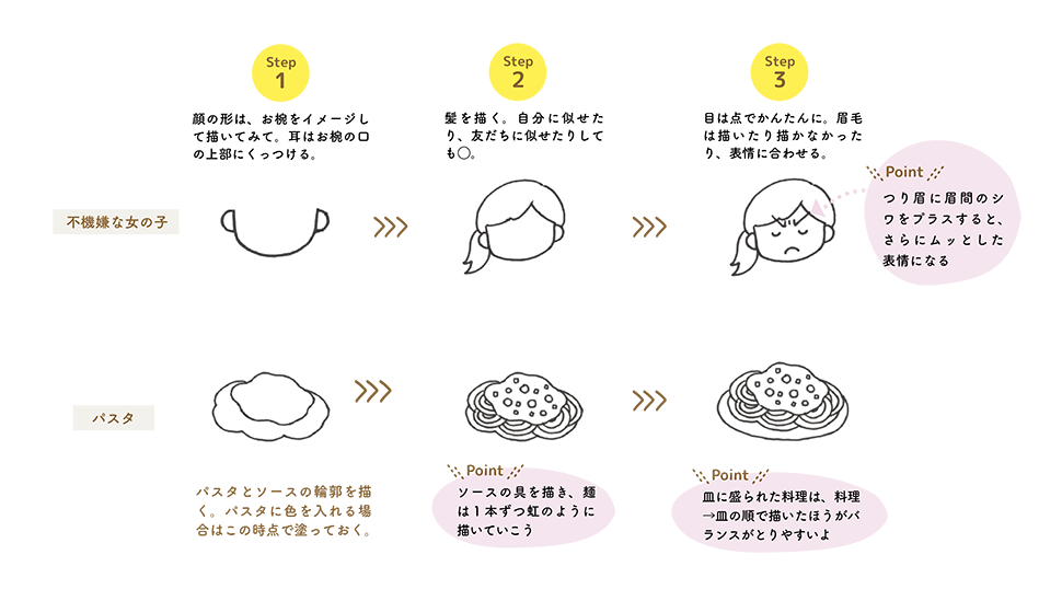 いざ描いてみるとバランスが変だったり、そもそもどこから描いていいのか分からなかったり、まねして描いたのにぜんぜんかわいく見えない! ということも。