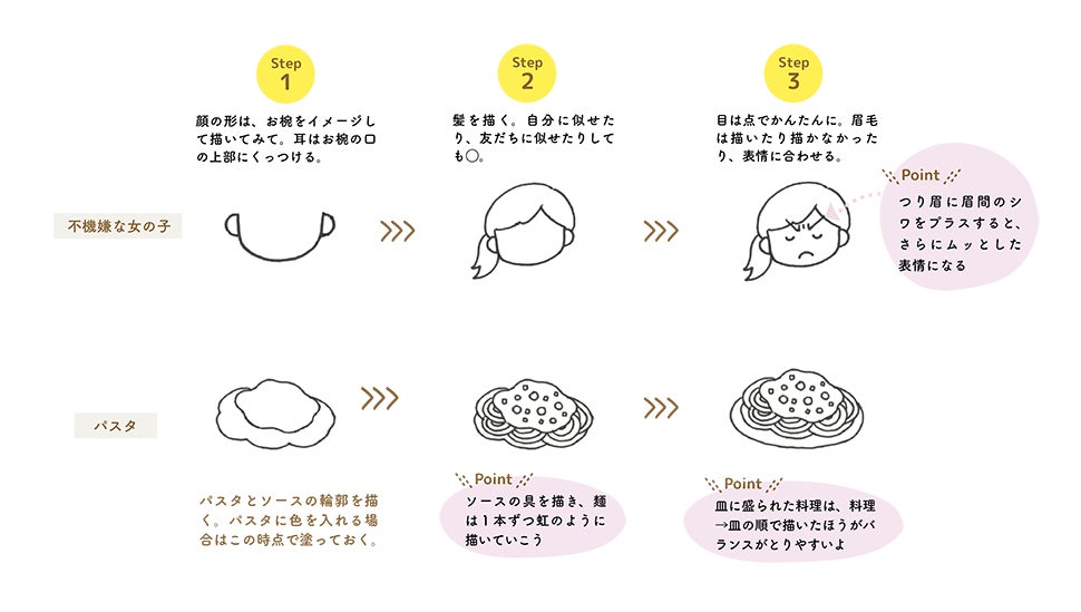 3ステップをまねるだけで描き方のコツが学べる。人物、動物、風景、雑貨、食べものなど新作イラストを800点以上掲載。