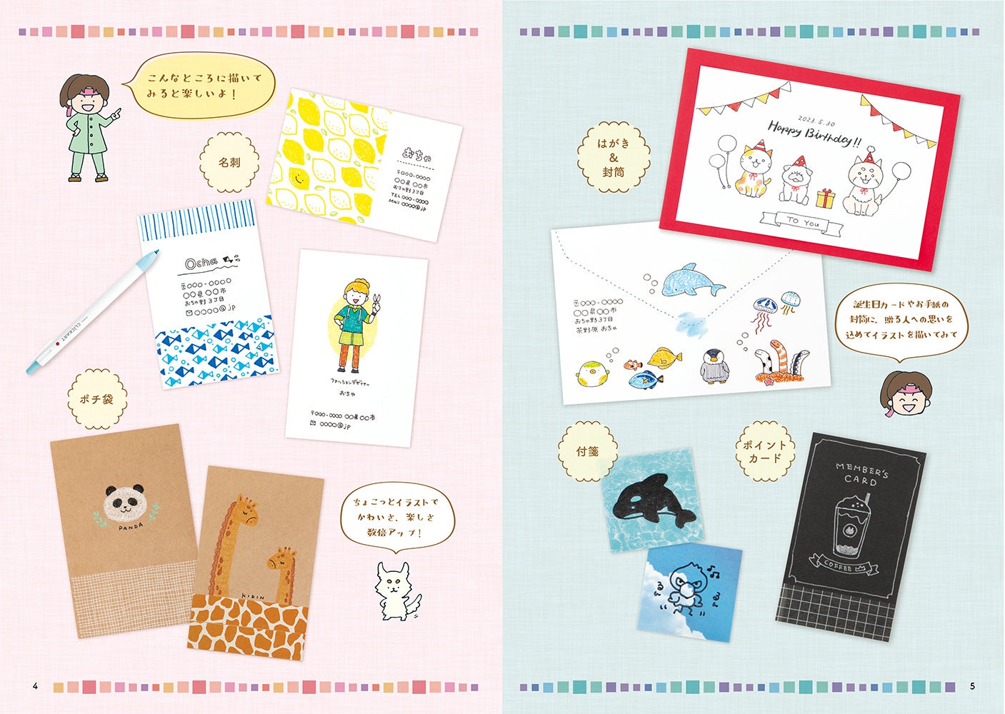 本書は人気イラストレーターochaの新作描き下ろしイラストを800点以上掲載。人物や動物、食べもの、風景、スケジュールや行事のイラストなど、日常生活の中で活躍頻度の高いテーマをチョイスしました。カードやラベル、絵はがき、メモや付箋など身の回りのアイテムにはもちろん、スケジュール帖や絵日記、トラベラーズノートなどにすぐに活用できます。