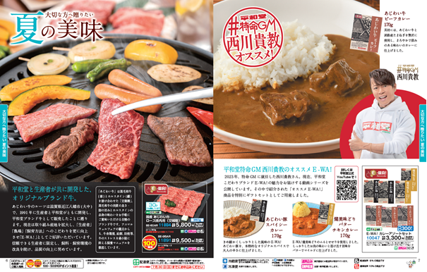 カタログギフト掲載商品は、表面からは糖度が高くジューシーな桃、平和堂オリジナルブランド牛「E-WA!あじわい牛」、伝統の加賀味噌と製法で仕上げた鮮魚の味噌漬け。そして平和堂特命GM西川貴教さんがオススメする平和堂こだわりブランドE-WA!カレーシリーズを特別にギフトセットとしてご用意しました。
