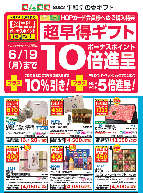 「平和堂HOPカード」「エールマインカード」会員様にはご購入特典をご用意しました。6月19日(月)までの期間限定として、ボーナスポイント10倍進呈となる超早得ギフトを、限定71アイテムご用意しました。7月5日(水)までの早期ご購入特典として、カタログ掲載商品全品本体価格より10%割引サービスをさせていただきます。また、通常の100~500ポイントのボーナスポイント進呈商品などお得な企画を多数取り揃えております。