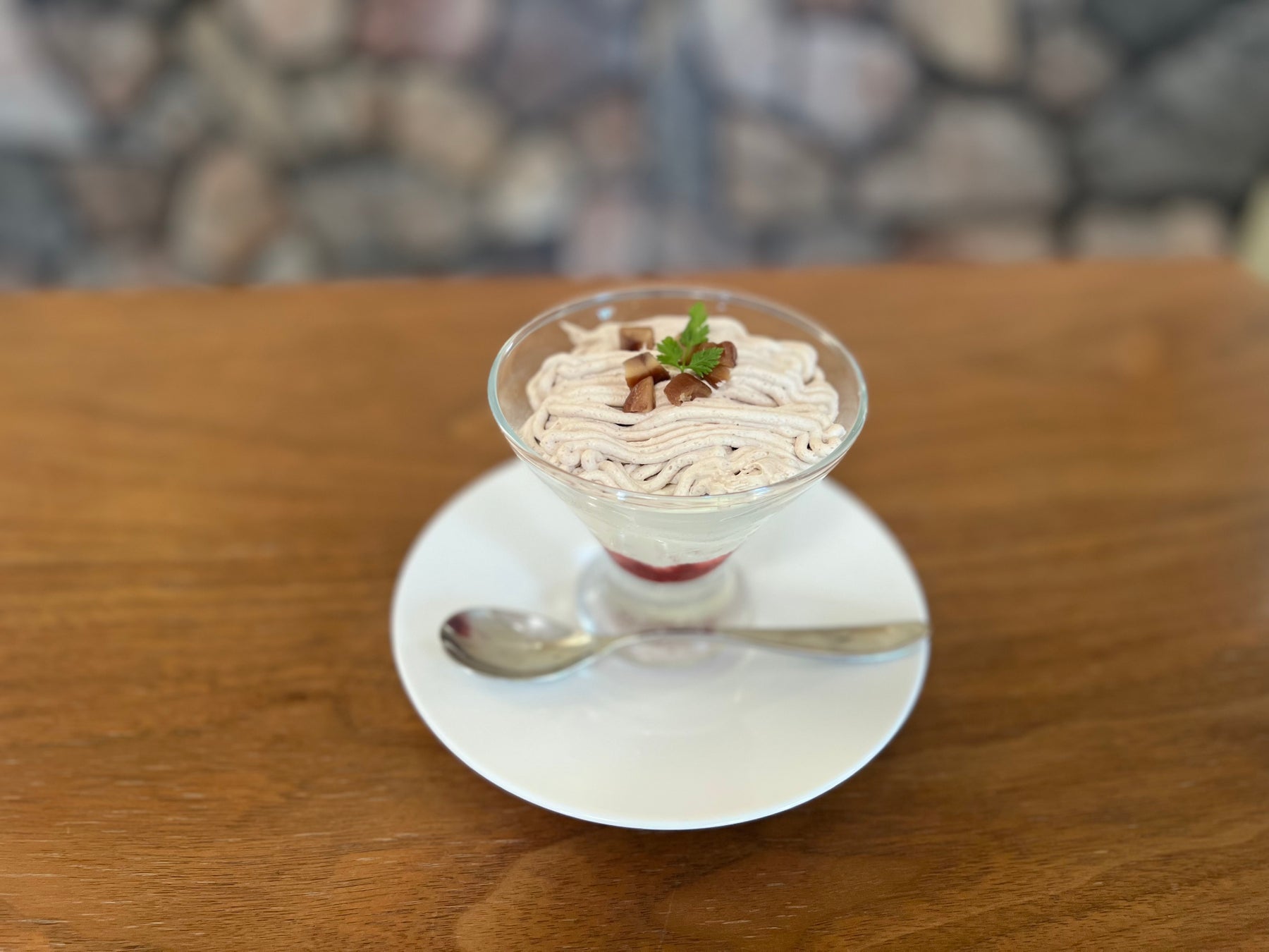 焼き栗の芳ばしい香りと甘みが凝縮されたシロップをラテに混ぜ、なめらかなモンブランクリームと