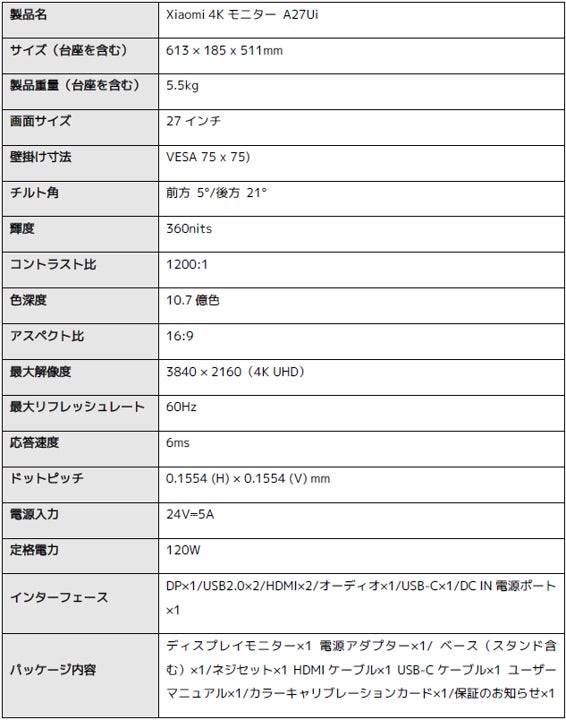 ■Xiaomi 4Kモニター A27Uiの製品特長