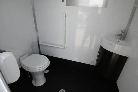 個室トイレを4室確保し、寒冷地でも快適に使用できるよう室内暖房、温水洗浄機能付洋式暖房便座を配置。換気扇や清掃用の排水口も整備し、室内を清潔な状態に確保。