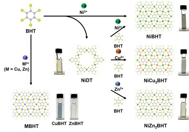 さらに、CuBHTおよびZnBHTのコロイド溶液の合成にも成功し、NiDTの空孔に別の金属イオンとBHTを導入することにより、非多孔性のNiCu₂BHTおよび新規化合物NiZn₂BHTの合成も実現しました。