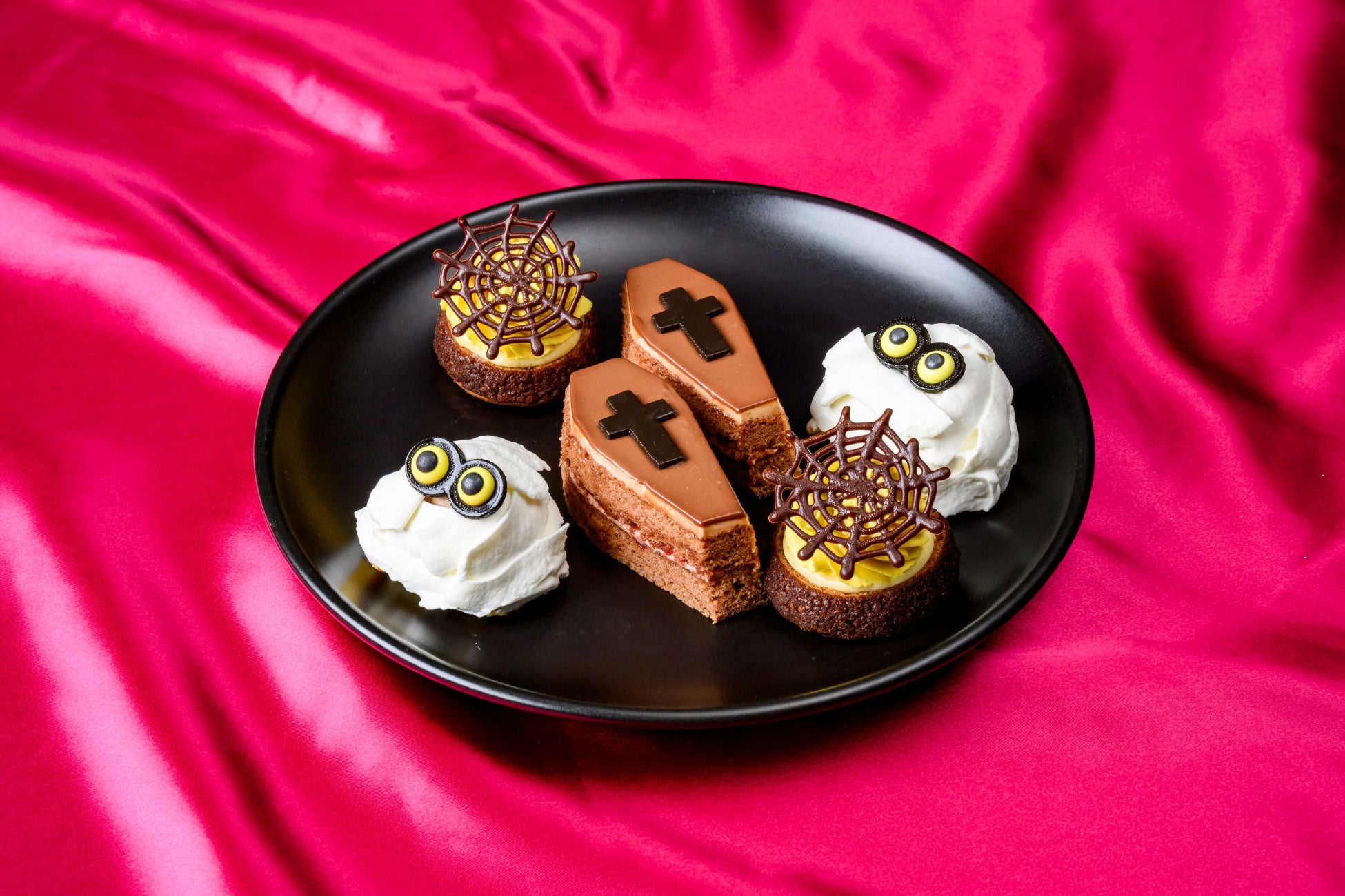 スイーツ6種:紫芋のモンスターモンブラン、魔女の毒リンゴショコラムース、かぼちゃのスパイダーシュー、ミイラ男のロールケーキ、棺桶ショコラ、ヴァンパイア ルージュグラス