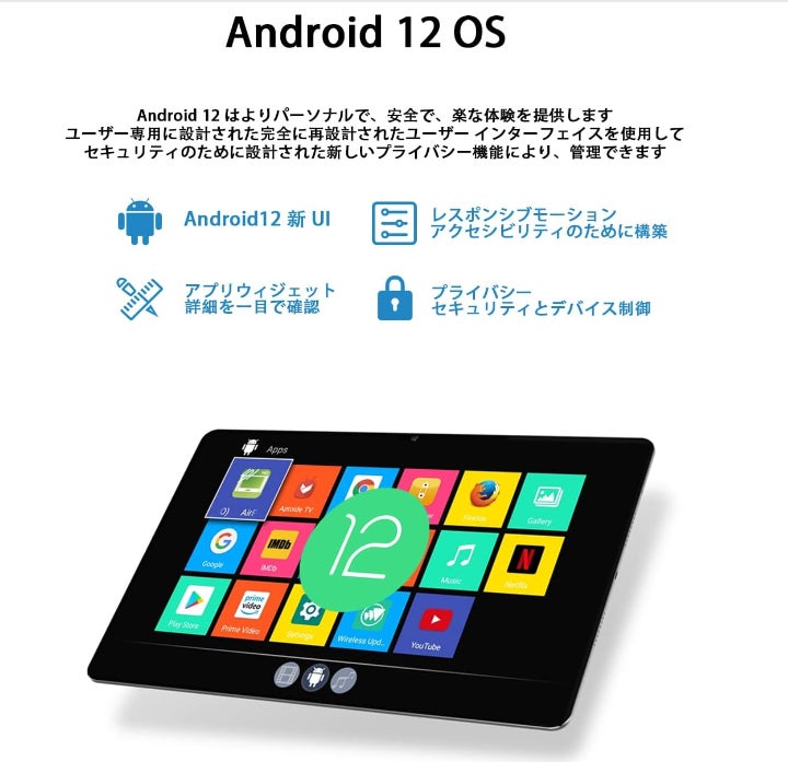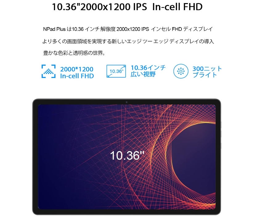 Npad PlusはN-ONEが発売する、オフィス・生活・学習のニーズに最大限応える、超ハイコストパフォーマンスを重視したタブレットパソコンです。 日常使いのスムーズさと高品質を追求しながらも、買い手は損をせず、売り手は節約できるよう、大衆に受け入れられやすい価格を維持しています。 10.4インチ Wi-Fi モデル、Andorid 12 オペレーティング システム、MTK 8183 8 コア CPU 2.0GHz、8GB+128GB+1TB 拡張可能、10 インチ 2K FHD IPS ディスプレイ、解像度 2000x1200 13MP/5MP + Bluetooth 5.0+GPS+2.4G / 5G WiFi + OTG + 6600mha + GMS。 詳しい設定についてはhttps://www.amazon.co.jp/dp/B0C1WFTCPVをご参照ください。