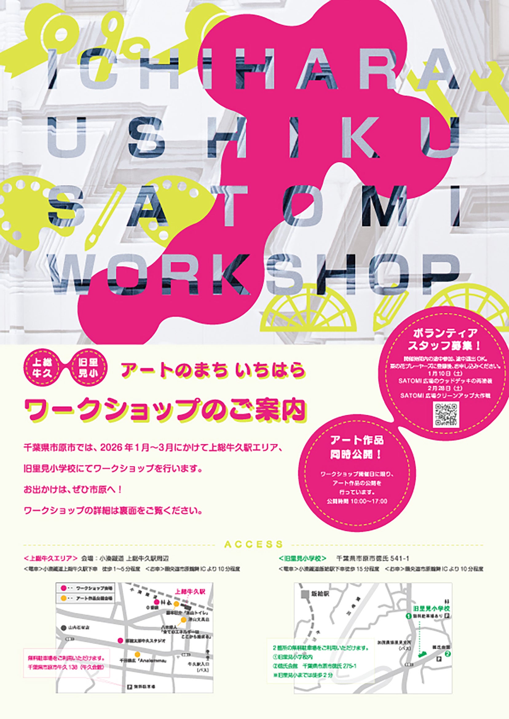 千葉県市原市では「アートのまちいちはら」の拠点のひとつである上総牛久駅周辺、旧里見小学校でワークショップ、アート作品展示を行います。