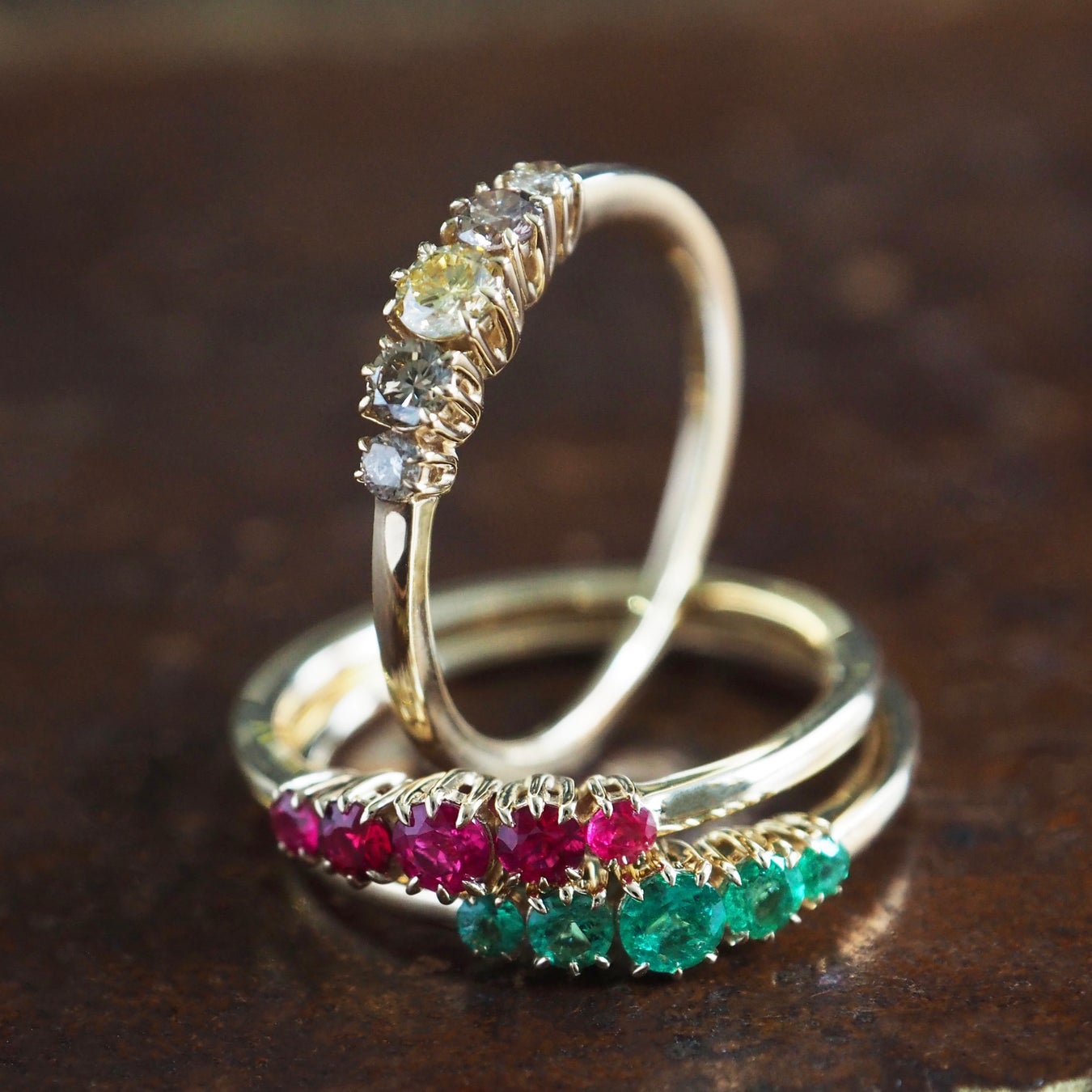 パーセル ジュエリー愛媛松山店では、ラウンドカットの宝石を連ねた新作リング「Pomme(ポム)」が登場。3mm・2.5mm・2mmの5石をサイズグラデーションで配し、上下の爪で挟むように留めた石が美しく連なるデザインです。クラシカルなルビーやローズカットダイヤモンド、色彩豊かなサファイアの組み合わせなど、多彩なバリエーションをご用意しております。