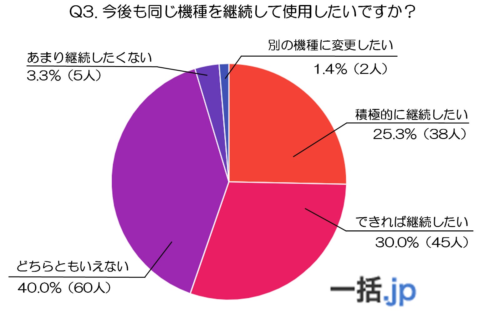 一方、「あまり継続したくない」は3.3%(5人)、「別の機種に変更したい」は1.4%(2人)にとどまり、現状に大きな不満を感じている利用者は少数派であることがわかります。