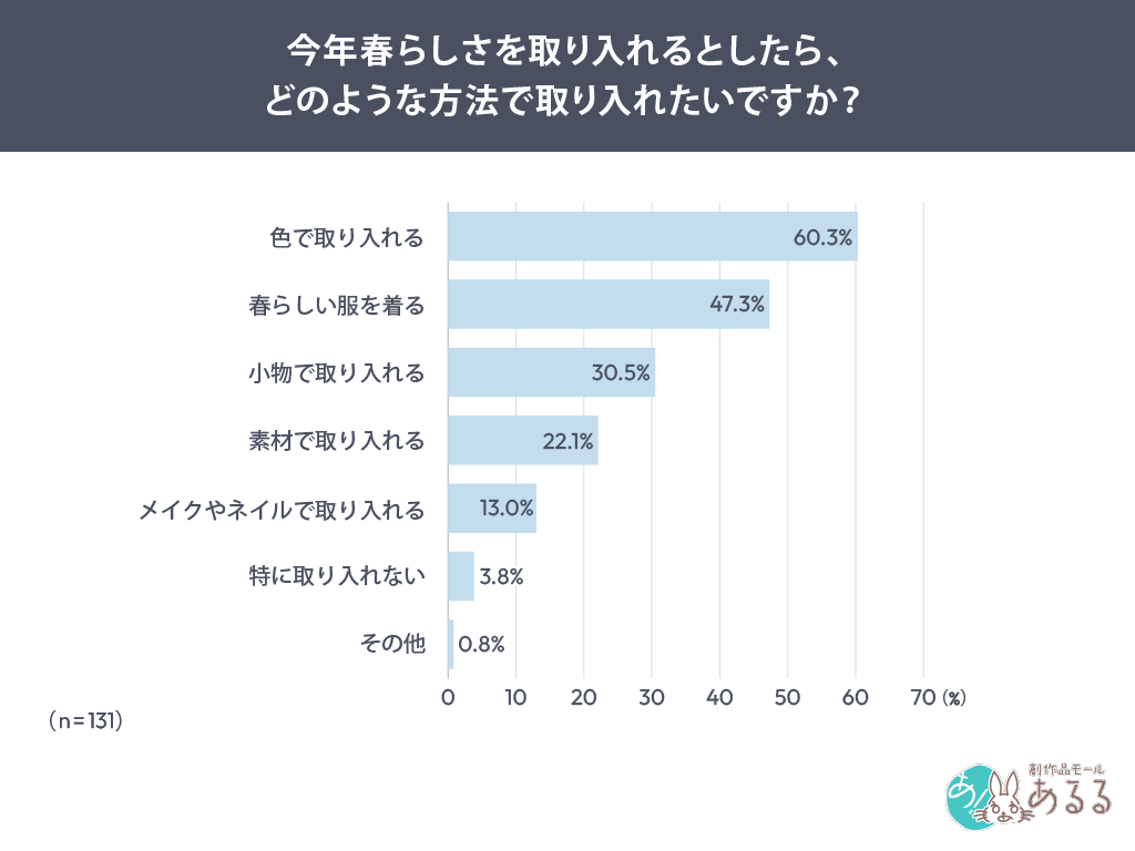 色や服、小物など複数の取り入れ方が挙がっており、春を楽しもうとする意識が一つの方法に偏らず存在していることが今回の結果から確認できました。
