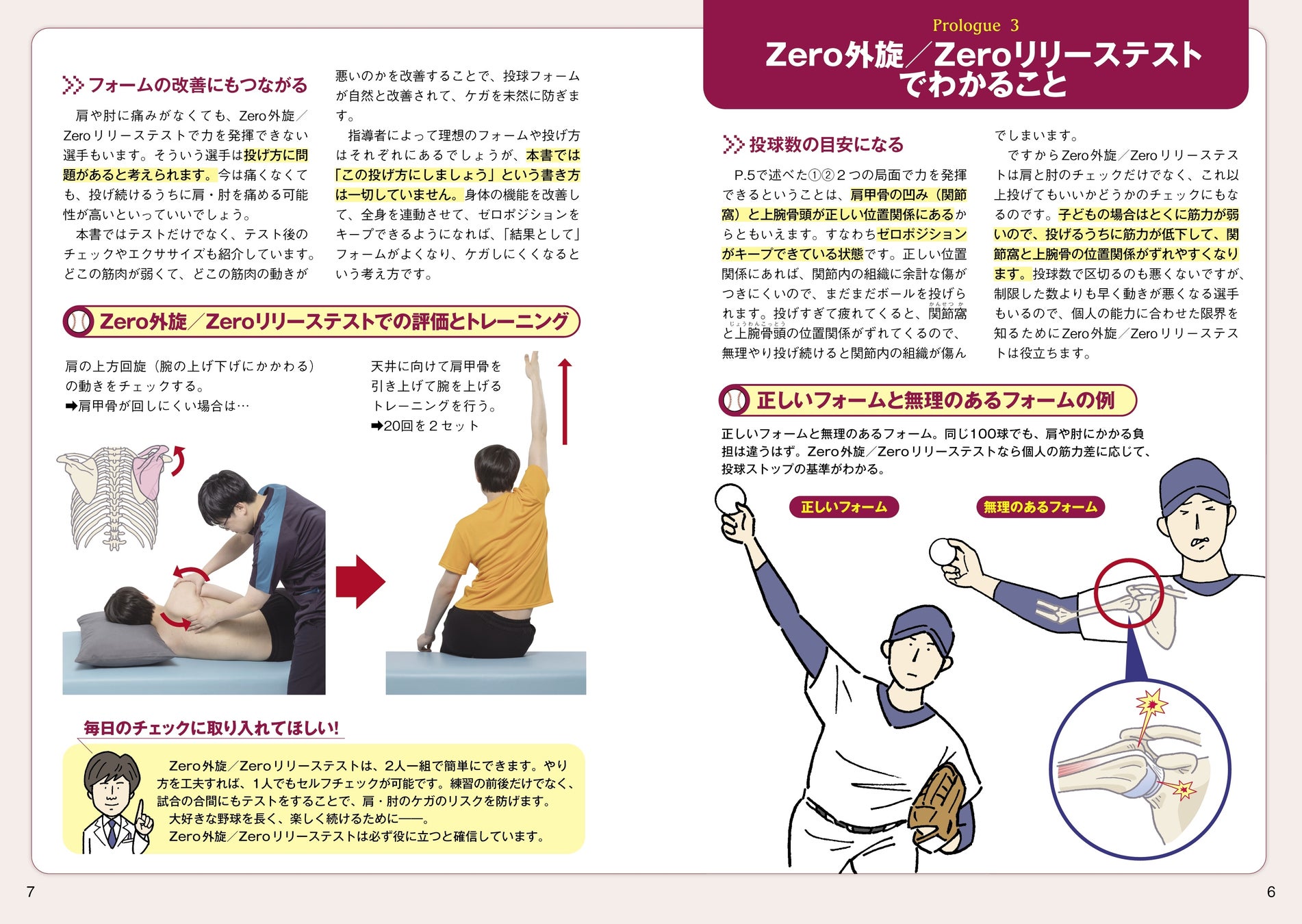 投球動作で肩と肘が最も安定する「ゼロポジション」ができているかを判断するためのテスト、「Zero外旋/Zeroリリーステスト」の解説、肩、肘の故障の種類、その治療法と手術などを紹介しています。