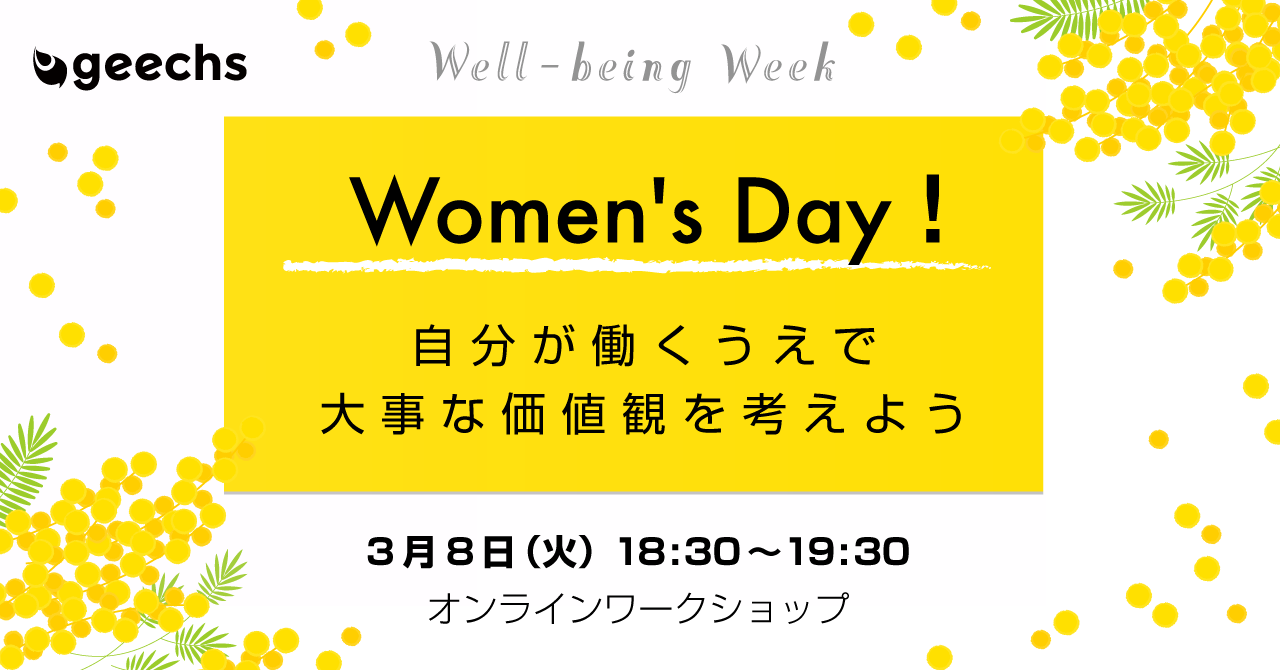 ギークス株式会社(本社:東京都渋谷区、代表取締役CEO:曽根原 稔人、以下ギークス)は、3月7日(月)~3月11日(金)の1週間を「Well-being Week」と題し、メンバーに向けてWell-beingの働きかけ・啓蒙に取り組みます。第1弾として、3月8日(火)の国際女性デーに、女性メンバーが自身の働く価値観を考える社内イベント「Women's Day!自分が働くうえで大事な価値観を考えよう」を開催します。