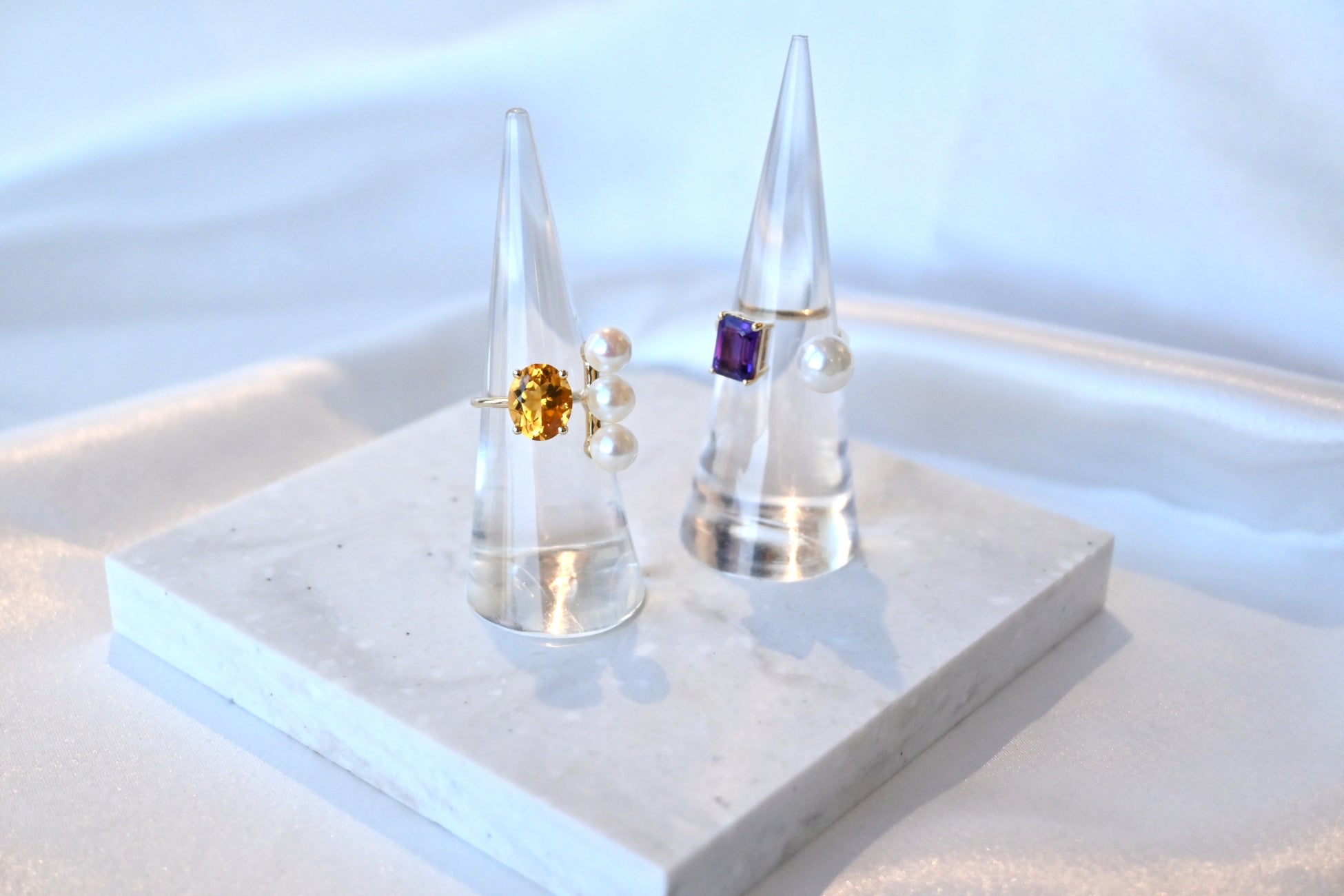 アップサイクルされた色とりどりの天然石と純白のアコヤパールのコンビネーションが華やかに指先を彩ってくれるアイテム。シンプルに洗練された1粒パールとリッチな気分にさせてくれる3粒パールの2種類をご用意しています。