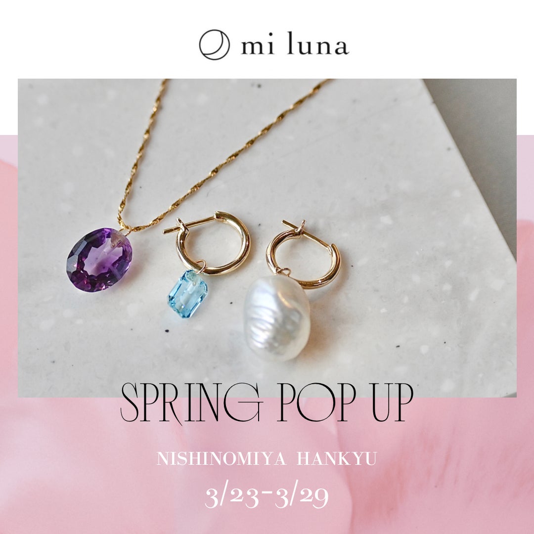 日本最大級のリユースデパートを展開する株式会社コメ兵(以下、KOMEHYO)のサステナブルジュエリーブランド「mi luna(ミ・ルーナ)」は、兵庫県で初となるPOP UP「SPRING POP UP」を2022年3月23日(水)~29日(火)の7日間で、西宮阪急(〒663-8204 兵庫県西宮市高松町14丁目1番)で開催します。