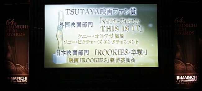 TSUTAYA映画ファン賞は、日本で最も長い歴史と伝統をもつ「毎日映画コンクール」の中で唯一、一般の方の投票により決定する賞で、昨年は総投票数164,254票の中から、日本映画部門では「ROOKIES -卒業-」、外国映画部門では「マイケル・ジャクソン THIS IS IT」が選ばれました。