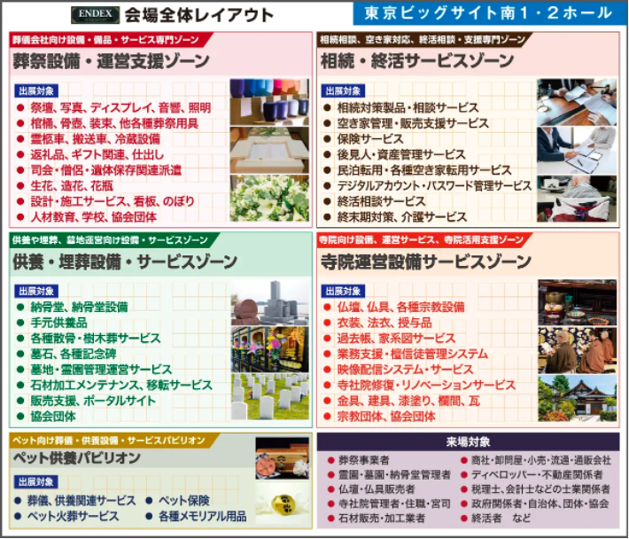 本展示会は、葬祭設備・運営支援ゾーン、供養・埋葬設備・サービスゾーン、寺院運営設備サービスゾーン、相続終活サービスゾーン、ペット供養パビリオンなど130社以上の企業が出展し、一堂に会する業界最大の展示会です。