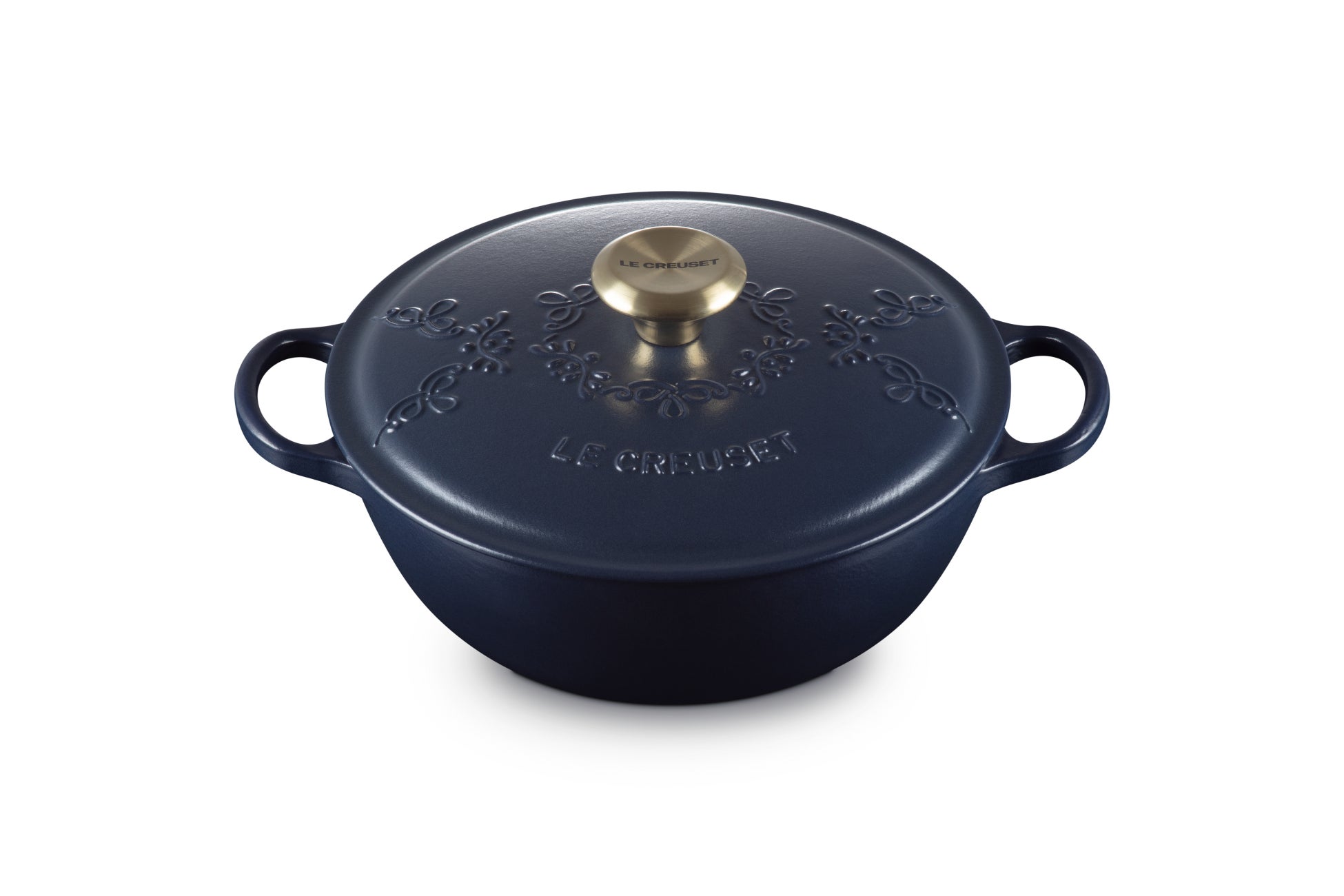 丸みを帯びた本体が特徴の「マルミット」のフタに、レースのようなエレガントなレリーフを施したシーズナル限定デザイン。マットな質感が美しい、雪を思わせる「コットン」と夜空を連想させる「ネイビー」の2色展開。レードルやターナーが使いやすい丸い鍋底は食材が混ぜやすく、野菜のソテーやリゾット作りに最適。骨付き肉や丸魚など大ぶりな食材も調理しやすい余裕のあるサイズで、大人数の料理にもおすすめです。
