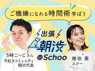 インターネットでの学びや教育を起点とした社会変革を行う株式会社Schoo(本社:東京都渋谷区、代表取締役社長CEO:森 健志郎、以下「スクー」)は、オンライン学習コミュニティ『Schoo』にて、5月16日(月)午前9時から「朝渋@Schoo『ご機嫌になれる時間術学ぼう』」の第1回授業を生放送します。