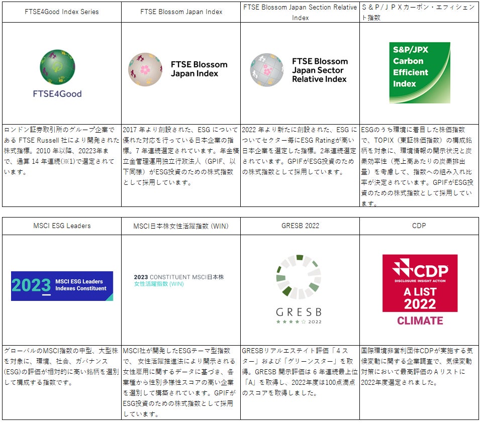上記の他、S&P Global社「Sustainability Year Book 2023」、Morningstar Japan ex-REIT Gender Diversity Tilt Indexに選定されています。