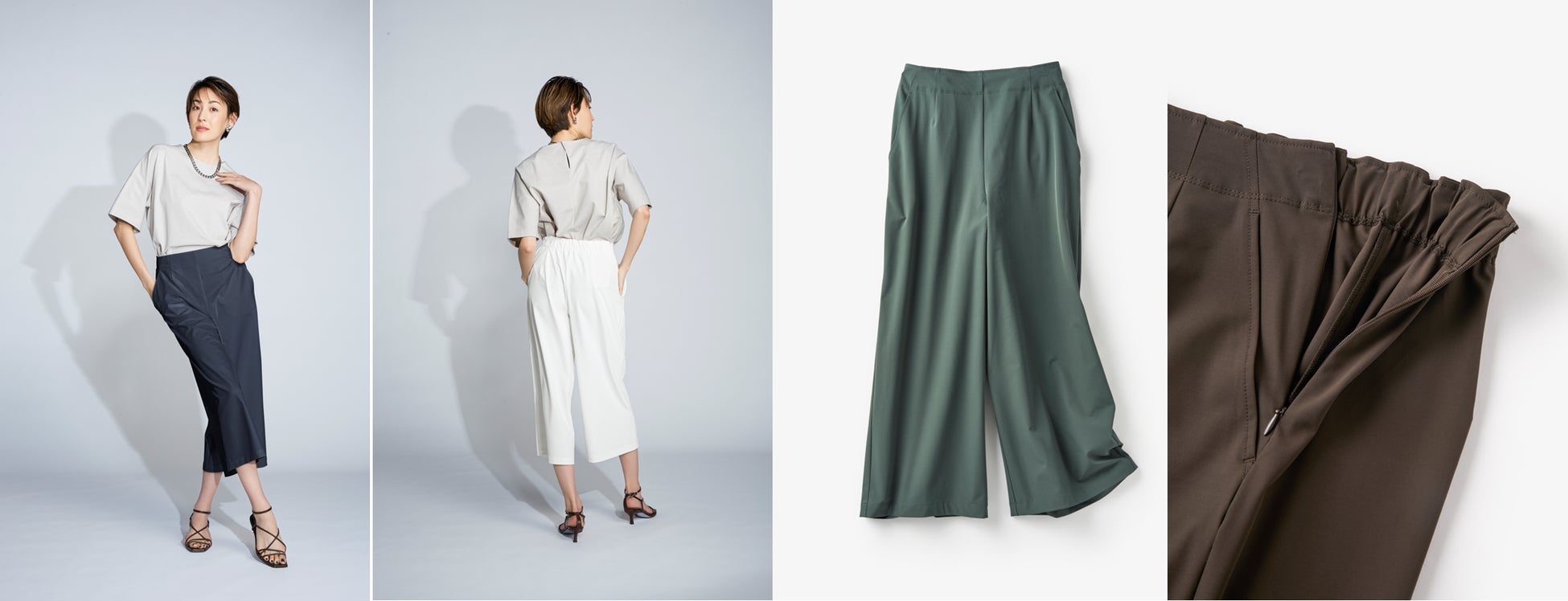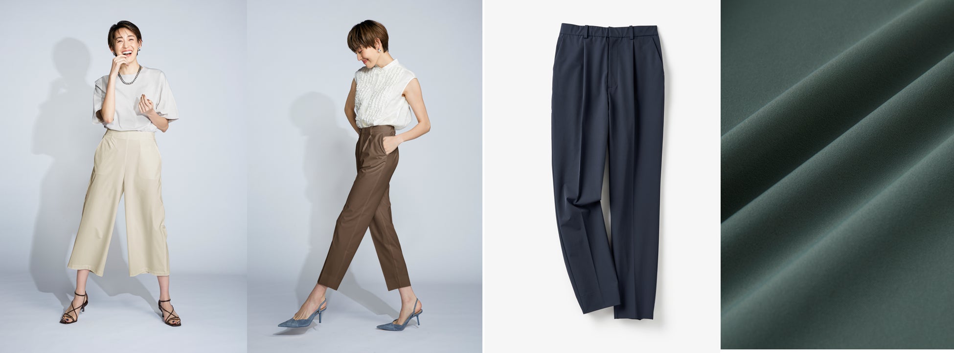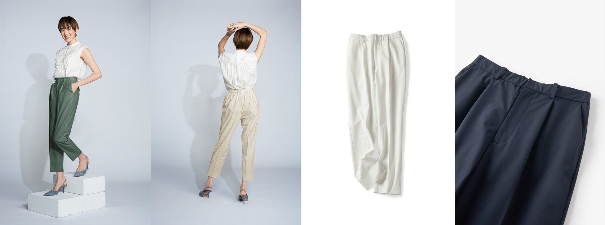 左サイドにファスナーを備え、お腹まわりをすっきりと見せる「5コンフォート・クロップドワイド」、ベルトループ×前開き仕様で、きちんと感のある「5コンフォート・スリムテーパード」の選べる2ラインをご用意しています。