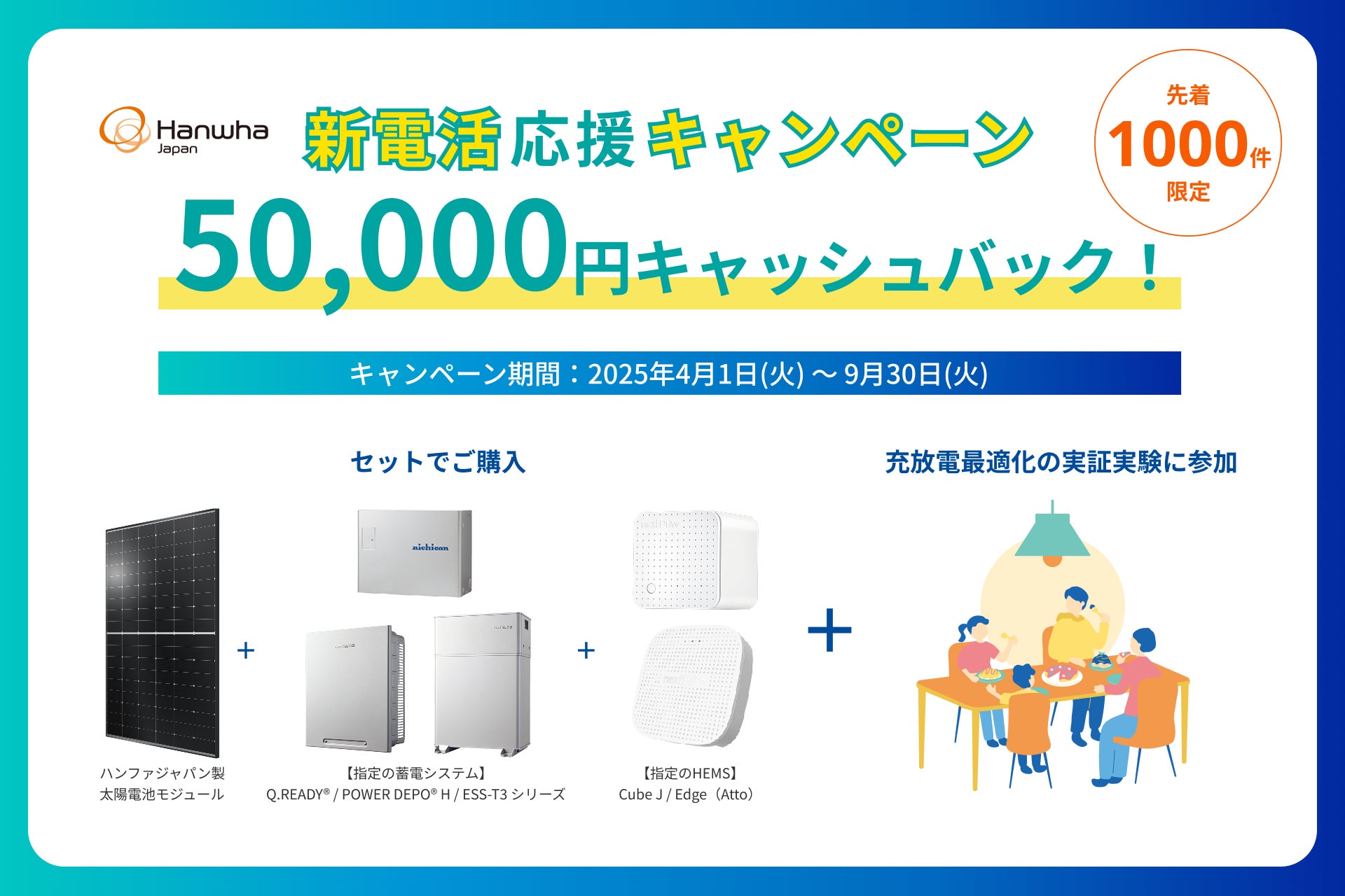 ハンファジャパン株式会社(所在地:東京都港区 代表取締役:張 熙載 以下、ハンファジャパン)は、2025年4月1日(火)から9月30日(火)までの期間中、ハンファジャパン製の太陽電池モジュールと指定の蓄電システム、およびHEMS(Home Energy Management System)をセットで新規にご購入いただき、充放電最適化の実証実験への参加に同意いただいたお客様を対象に、50,000円のキャッシュバックをおこなう「新電活応援キャンペーン(以下、本キャンペーン)」を実施いたします。
