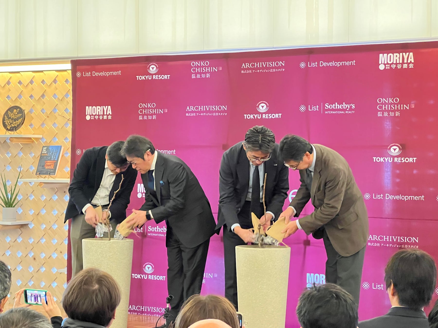 セレモニー中盤ではダイニングで提供する長野県産のワインに合わせ、株式会社ヴィラデストワイナリー代表取締役社長 小西 超氏が登壇し、長野ワインについてお話いただいた後、ぶどうの苗木植樹パフォーマンスを行い、開業を祝いました。