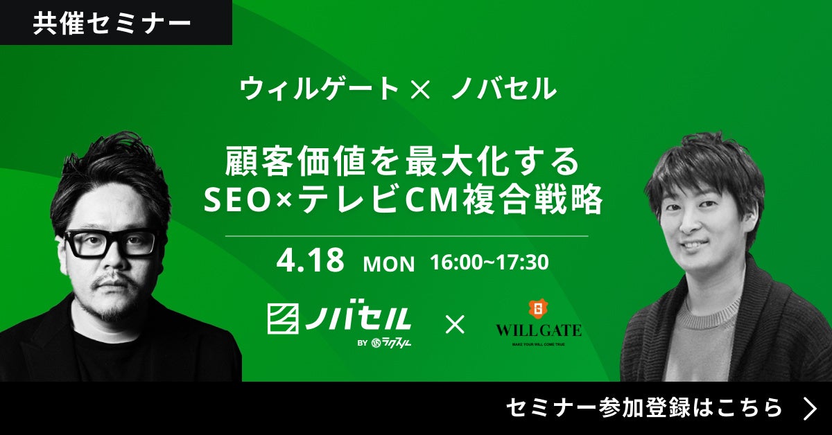 ウィルゲート、ノバセル社と《顧客価値を最大化するSEO×テレビCM複合戦略》をテーマにオンラインセミナーを開催
