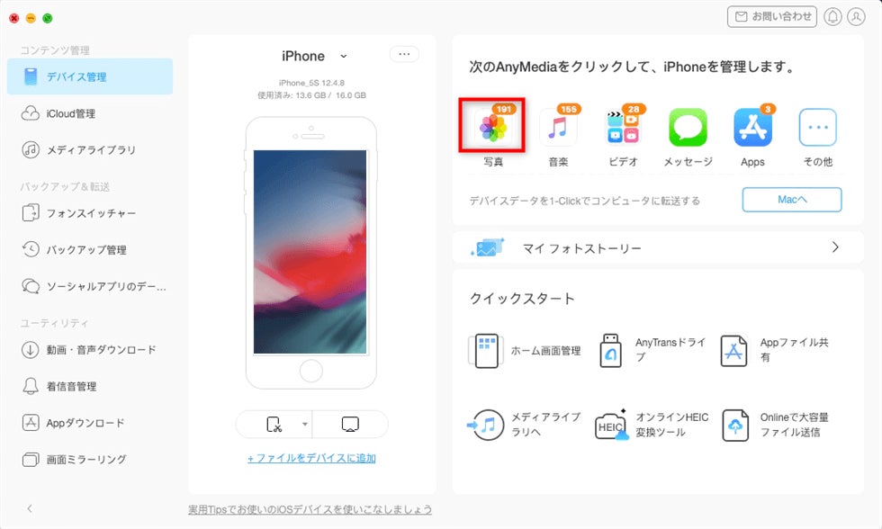 2.iPhoneをUSBケーブルでMacに接続して、AnyTransを起動 > 「 写真」項目をクリックしてください。