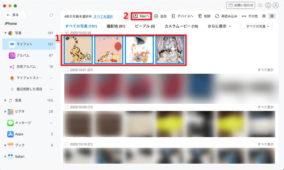 3.Macに保存したい写真を選択して、右上の「Macへ転送」ボタンをクリックします。