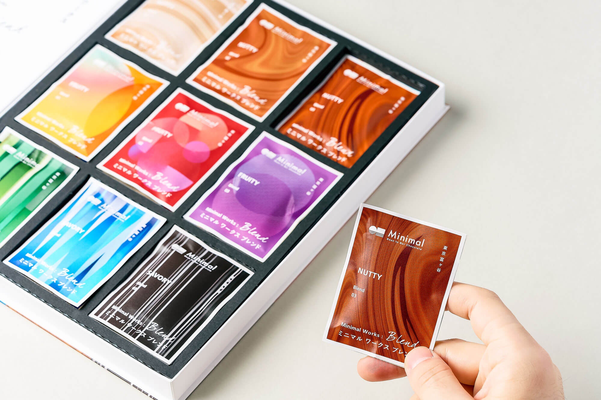 今回はその中でも代表的なフレーバーであるNUTTY(ナッツのようなフレーバー)/FRUTIY(フルーツのようなフレーバー)/SAVORY(植物や花のようなフレーバー)という3カテゴリーをさらに9種類の板チョコレートで表現しました。