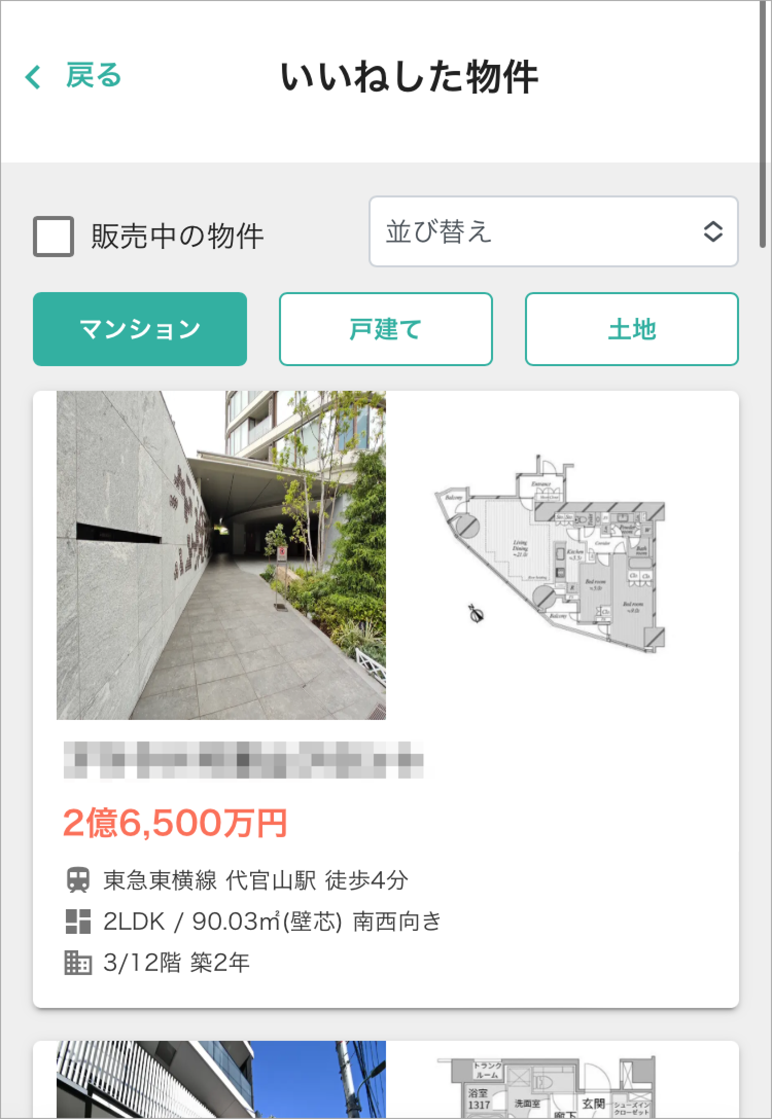”いいね”した物件を一覧で確認できます。物件の詳細な情報も閲覧可能です。