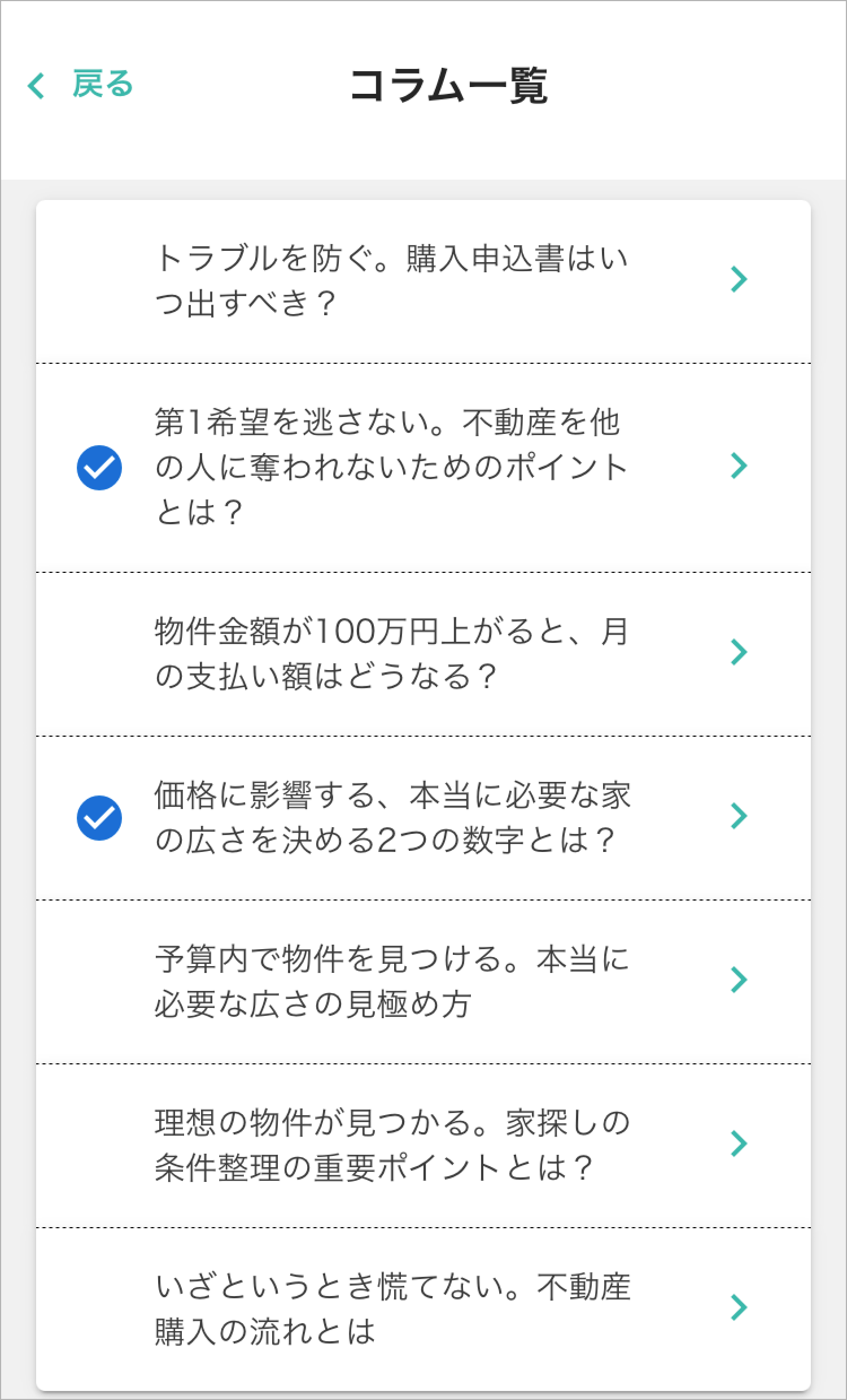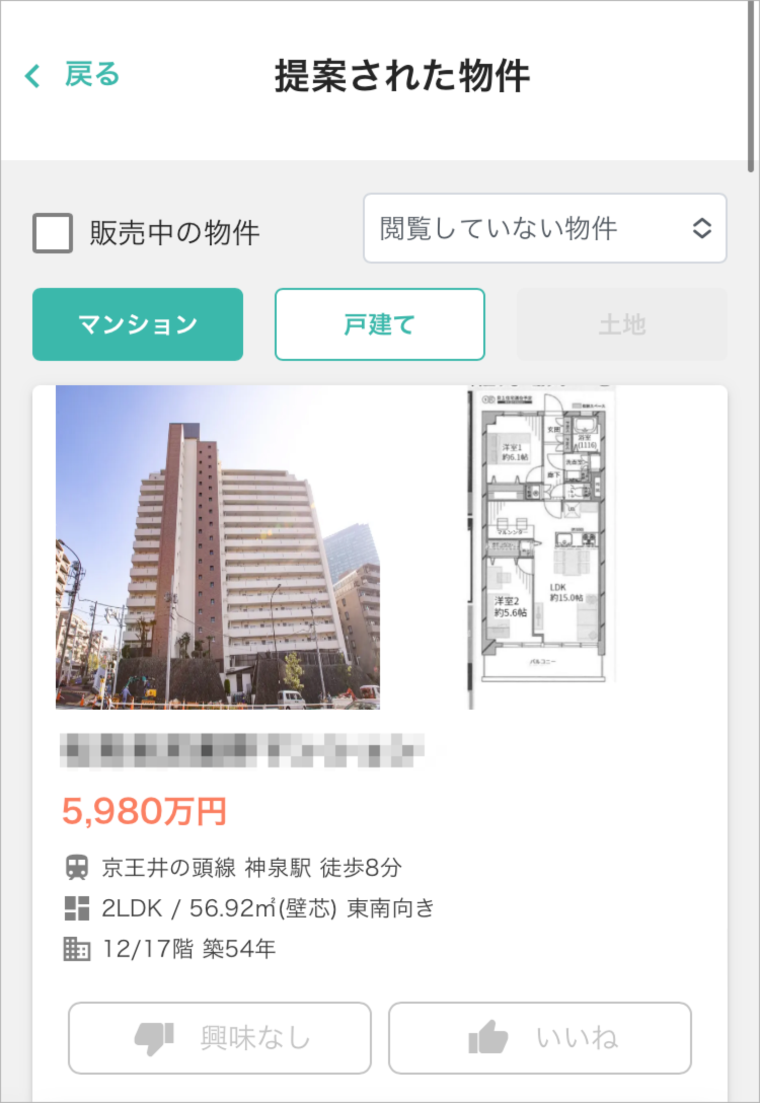 担当者から買主に提案された物件が一覧で確認できます。物件の詳細な情報も閲覧可能です。