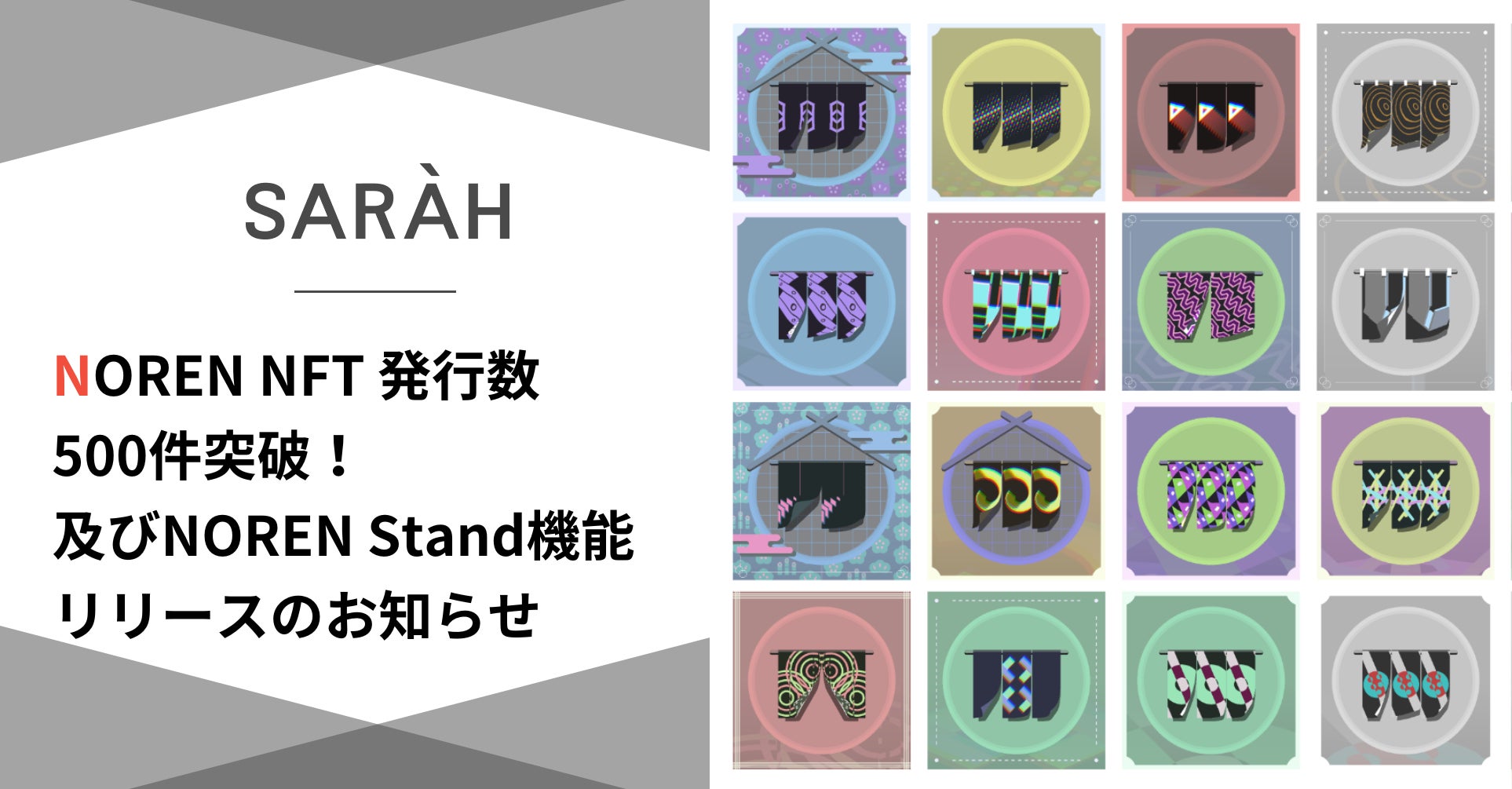 株式会社SARAH(本社:東京都千代田区、代表取締役CEO:酒井勇也)は、Web3グルメアプリ「SARAH」において発行されているNOREN NFTの獲得数が500件を突破したことを発表いたします。これに伴い、ユーザーがNOREN NFTの保有上限を拡張できる新機能「NOREN Stand」をリリースしました。本機能は、ユーザーがSARAH内で集めたUMEを使用することで、NOREN NFTの保有数を増やすことができ、より多くの飲食店を応援できるようになります。