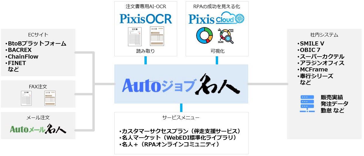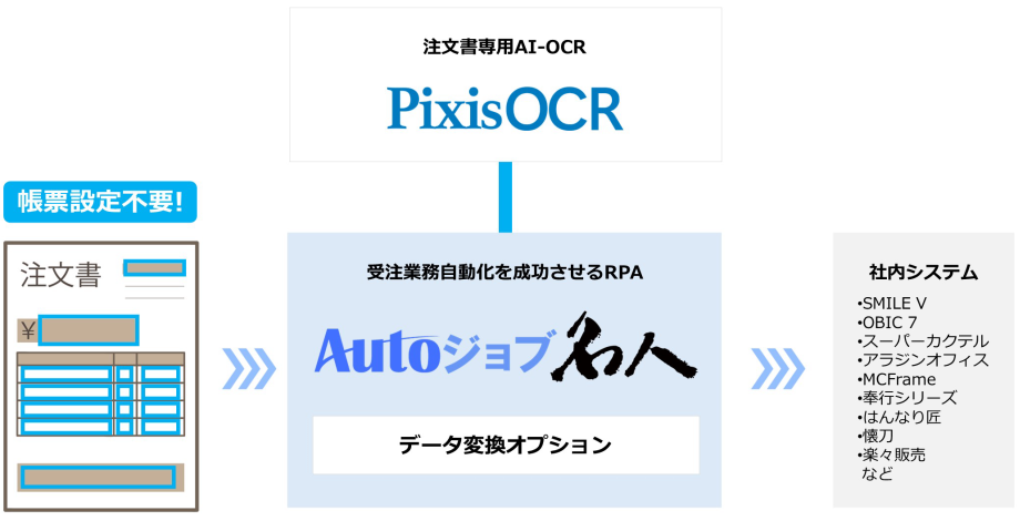 受注業務の自動化に定評がある『Autoジョブ名人』。新バージョンは、注文書の読み取りに特化したAI-OCR「Pixis OCR」を新たに搭載。Web受注のみならず、FAX受注の自動化もお任せください。