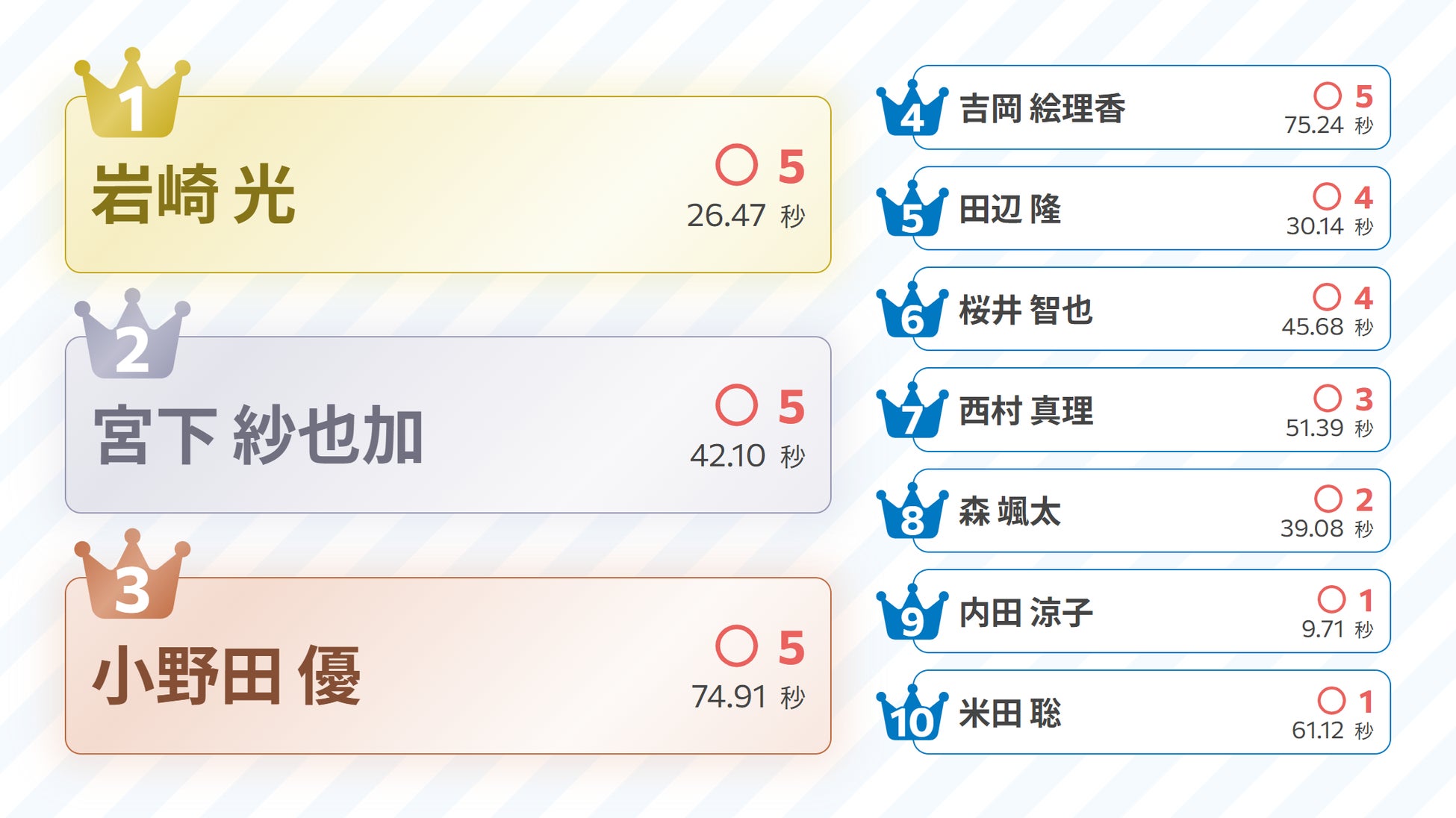 解答の発表ごとにリアルタイムで採点され、全問題終了時には上位入賞者のランキングが発表されます。難しい操作は不要で、数十人から数千名まで、どんな規模でも盛り上がるクイズイベントが実現できます。