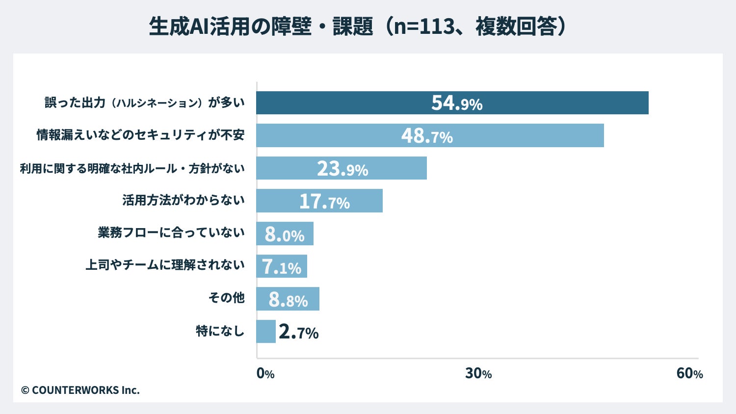 主な課題・障壁は「誤った出力(ハルシネーション)」(54.9%)が最も多く、次いで「セキュリティ不安」(48.7%)、「社内ルール不在」(23.9%)。