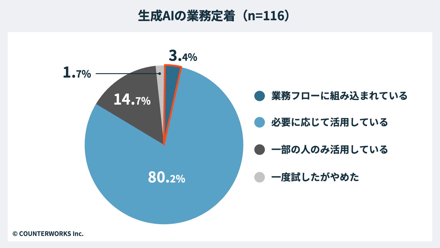 一方で、活用の定着度に関しては、「必要なときだけ使っている」と回答した人が80.2%を占め、「業務フローに恒常的に組み込んでいる」と答えたのはわずか3.4%にとどまりました。多くの担当者が個人の判断で柔軟に活用している段階であり、組織として生成AIを標準プロセスに組み込む仕組みづくりはこれからといえそうです。